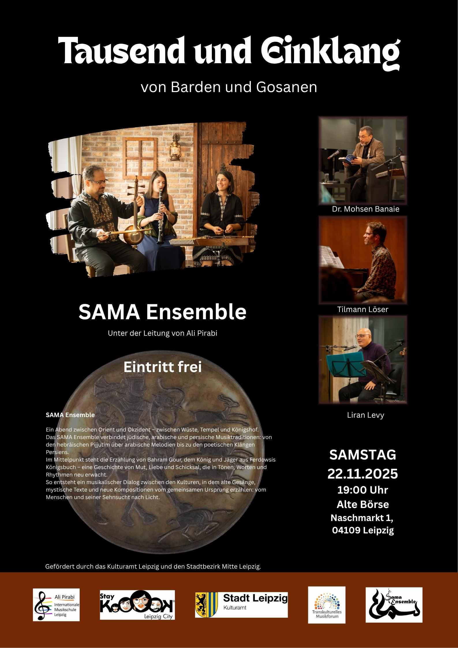 wir freuen uns, Ihnen das neue Konzertprojekt des SAMA Ensembles vorzustellen:„Tausend und Einklang (von Barden und Gosanen)“ – ein Abend zwischen Orient und Okzident, zwischen Wüste, Tempel und Königshof. Unter der musikalischen Leitung von Ali Pirabi und mit der Erzählung von Dr. Mohsen Banaie erleben Sie eine faszinierende Verbindung jüdischer, arabischer und persischer Musiktraditionen: von ... Weiterlesen ...